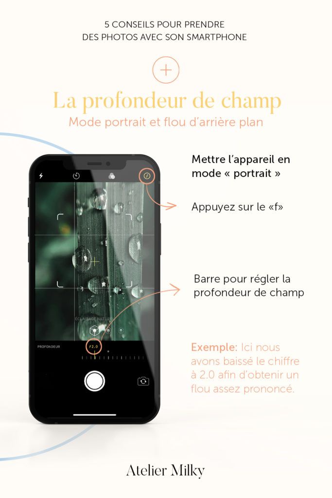 Lorsque vous prenez une photo en mode portrait avec un smartphone, il est possible de gérer la profondeur de champ (aka, gérer l’intensité du flou d’arrière plan). Lors de votre prise de vue, mettez l’appareil en mode « portrait » et touchez le « f » dans le coin supérieur droit. Une barre apparait en bas de l’écran et vous pouvez choisir d’ajuster la profondeur de champ. Plus le chiffre est petit, plus l’arrière plan sera flou. A l’inverse plus le chiffre est grand plus l’arrière plan sera net. Si vous n’avez pas eu l’occasion de choisir votre réglage lors de la prise de vue, vous avez toujours l’opportunité de modifier cela après. Ouvrez la photo, cliquez sur "modifier" et touchez le "f" dans le coin supérieur gauche. La même barre apparaîtra et vous pourrez ajuster la profondeur de champ. Attention: cela ne fonctionne que si vous avez pris votre photo en mode portrait.