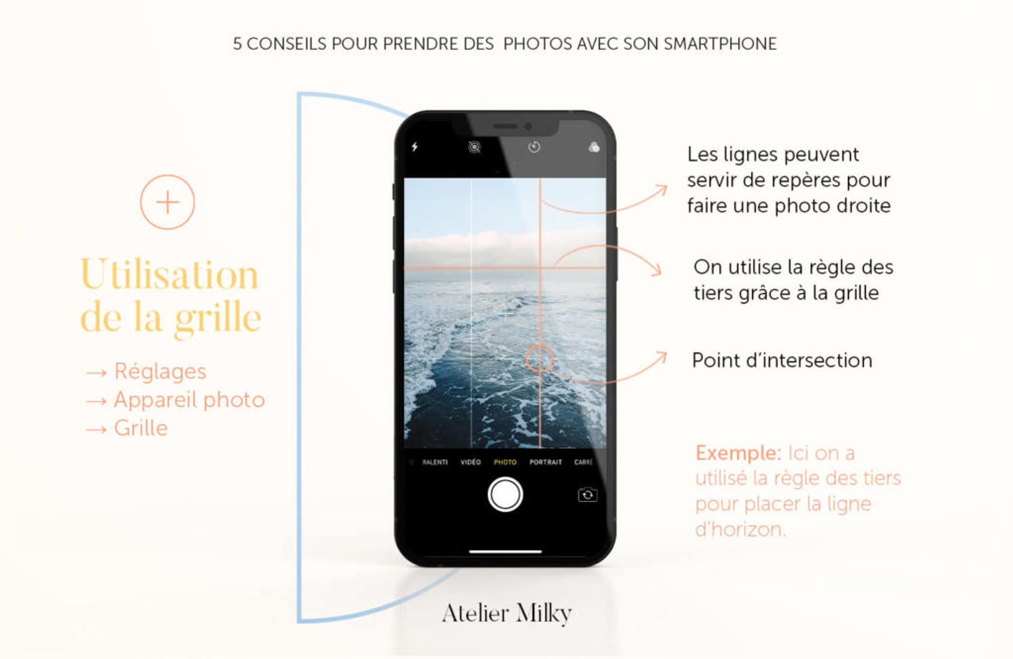 Ce titre peut faire peur mais c'est relativement simple à comprendre. Pour activer la fonction grille et l'utiliser quand vous prenez des photos avec votre smartphone, il suffit d'aller dans les réglages de votre téléphone, ensuite dans « appareil photo » et puis activer le mode « grille ». (Réglages > Appareil photo > Grille).