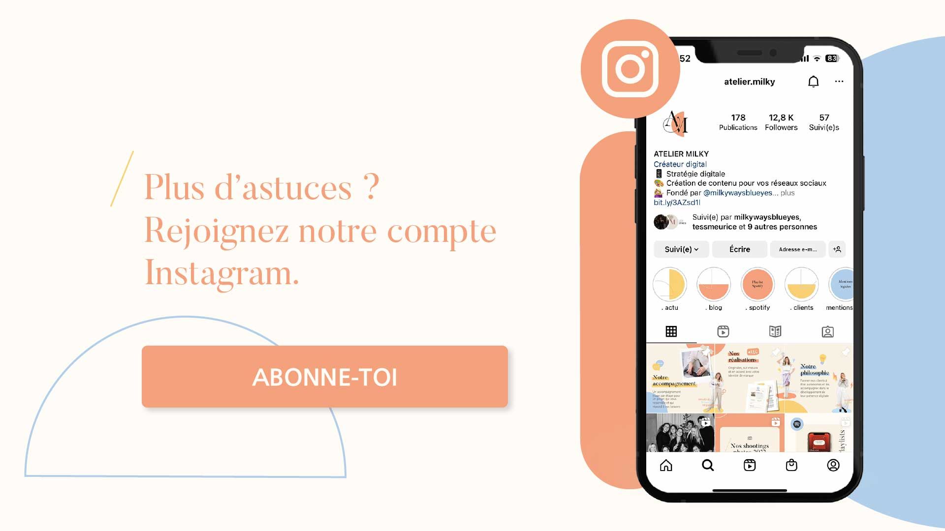 Atelier Milky a produit un tout nouvel ebook pour vous guider dans votre stratégie. Nous vous accompagnons dans la réactivation de votre compte Instagram ! Toute l'équipe s'est réunie pour créer ce document d'une centaine de pages. Ce dernier vous poussera à avoir une réflexion globale sur votre marque et vous aidera à prendre des décisions marketing.